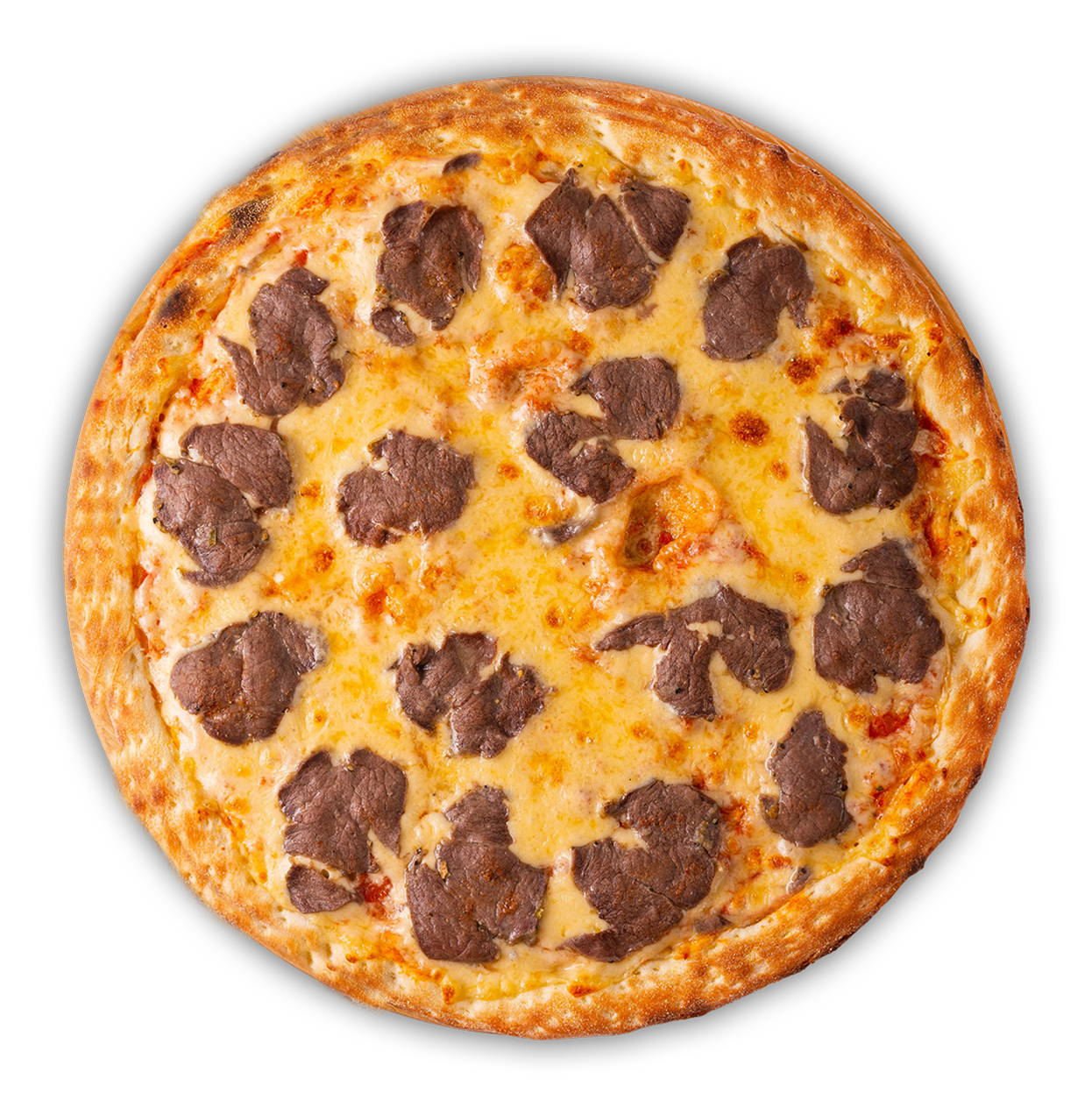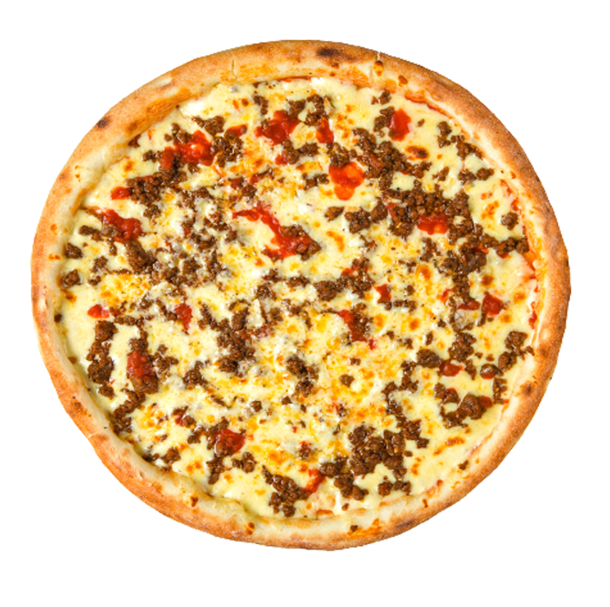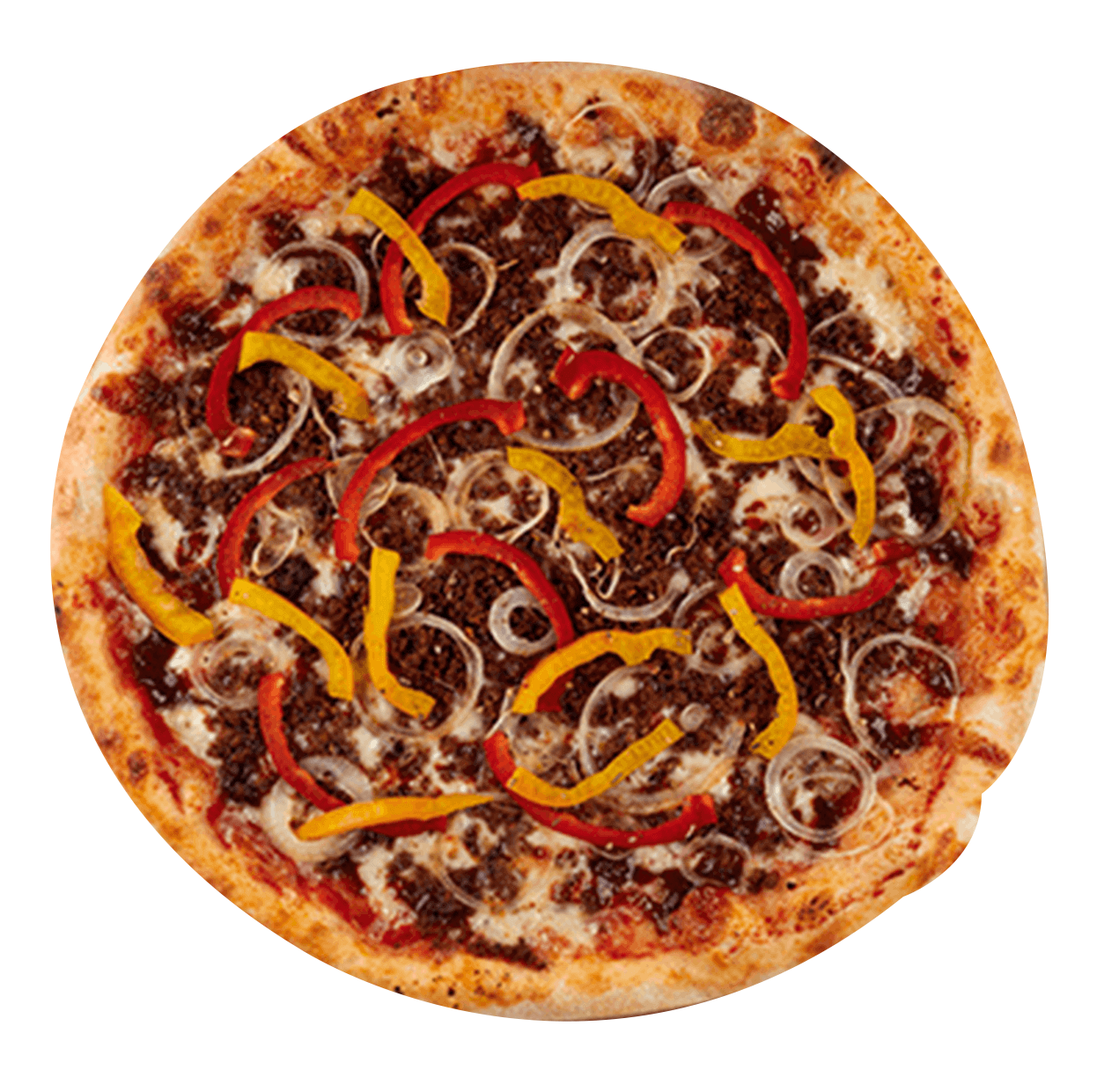Sauce barbecue, mozzarella, viande hachée, oignons, poivrons.