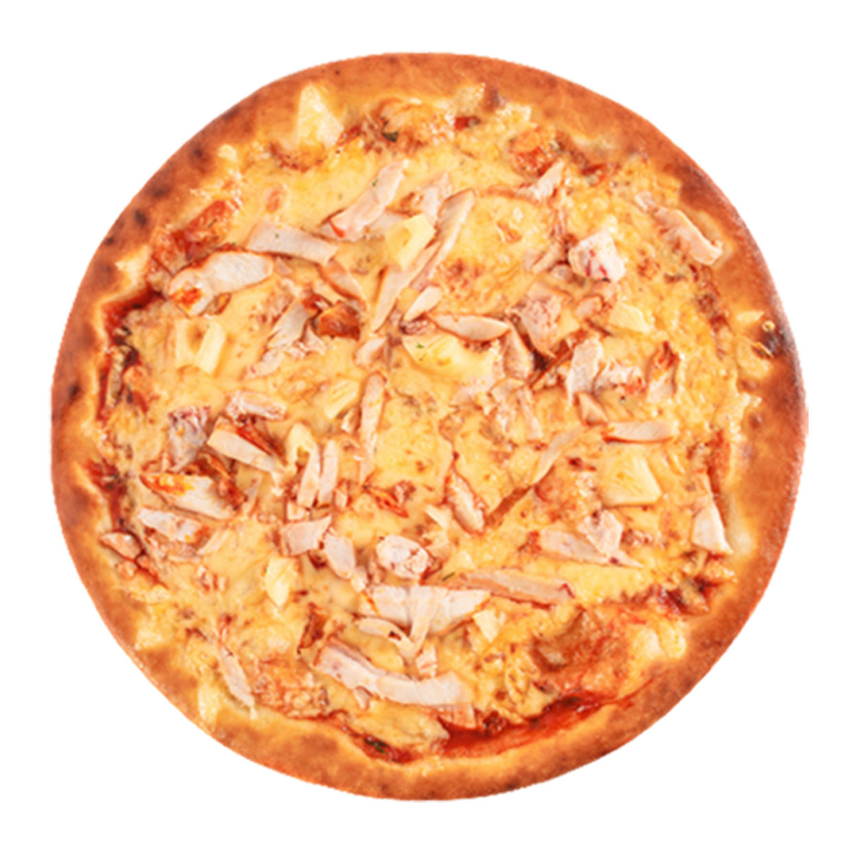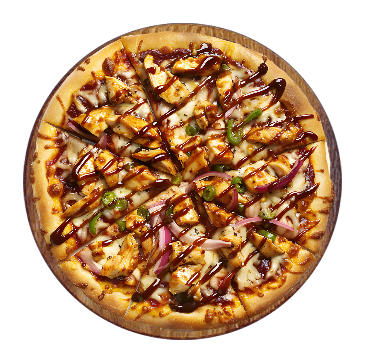 Sauce barbecue, mozzarella, poulet, poivrons, oignons, olives.