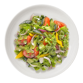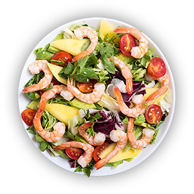 Salade, tomates, avocat, crevettes, vinaigrette.