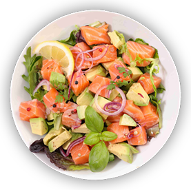 Salade, tomates, saumon fumé, avocat, citron, vinaigrette.