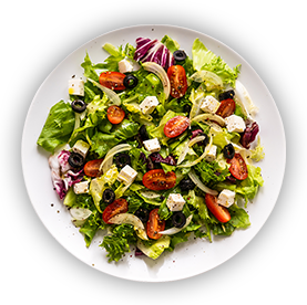 Salade, tomates, mozzarella, basilic, olives, huile d'olive.