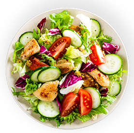 Salade, tomates, poulet, pommes de terre, cornichons, vinaigrette.